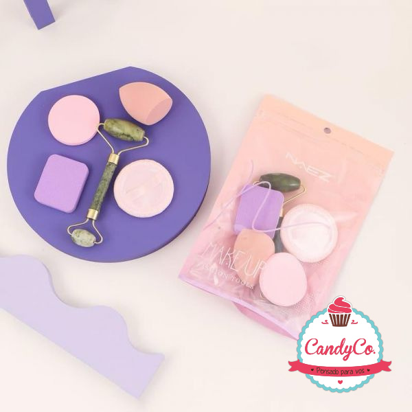 Set de Rodillo Masajeador Facial y Esponjas para Maquillaje, Gota, y Pads Redondos, Rectangular en sobre Naez