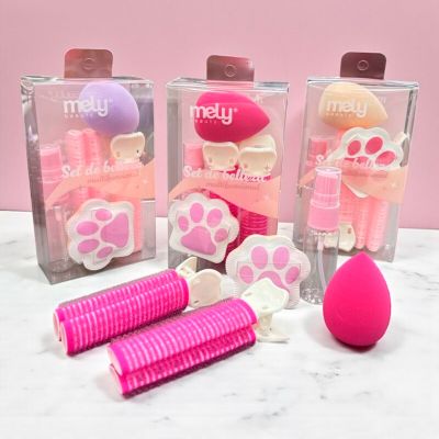 Set de Belleza Multifuncional X5 Piezas con Esponja para Maquillaje con Forma de Gota, Pad con Diseño de Huella, Botella Cosmética, y Ruleros X2 en Caja Mely Beauty