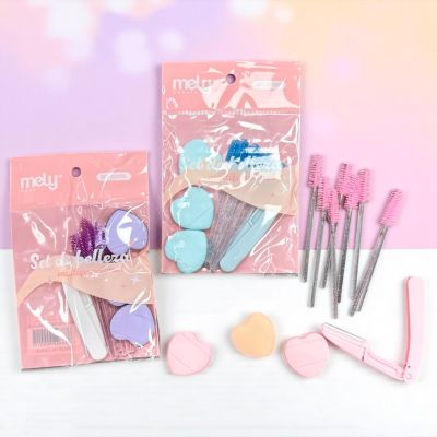 Set de Belleza Multifuncional X12 Piezas con Esponjas para Maquillaje, Pads con Forma de Corazón X3, Cepillos para Cejas y Pestañas X8, y Depiladora, Perfiladora Retráctil en sobre Mely Beauty